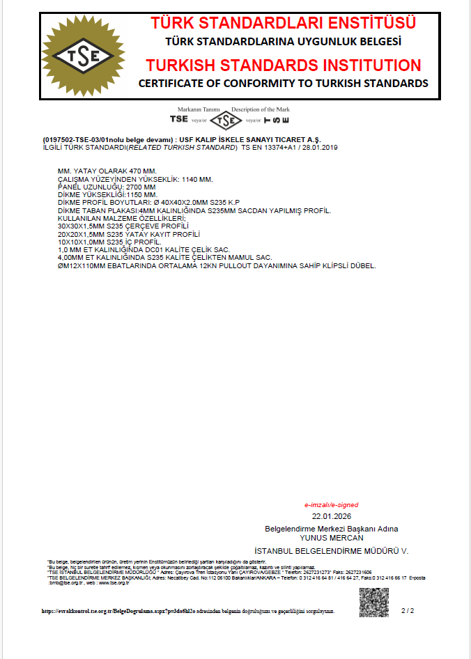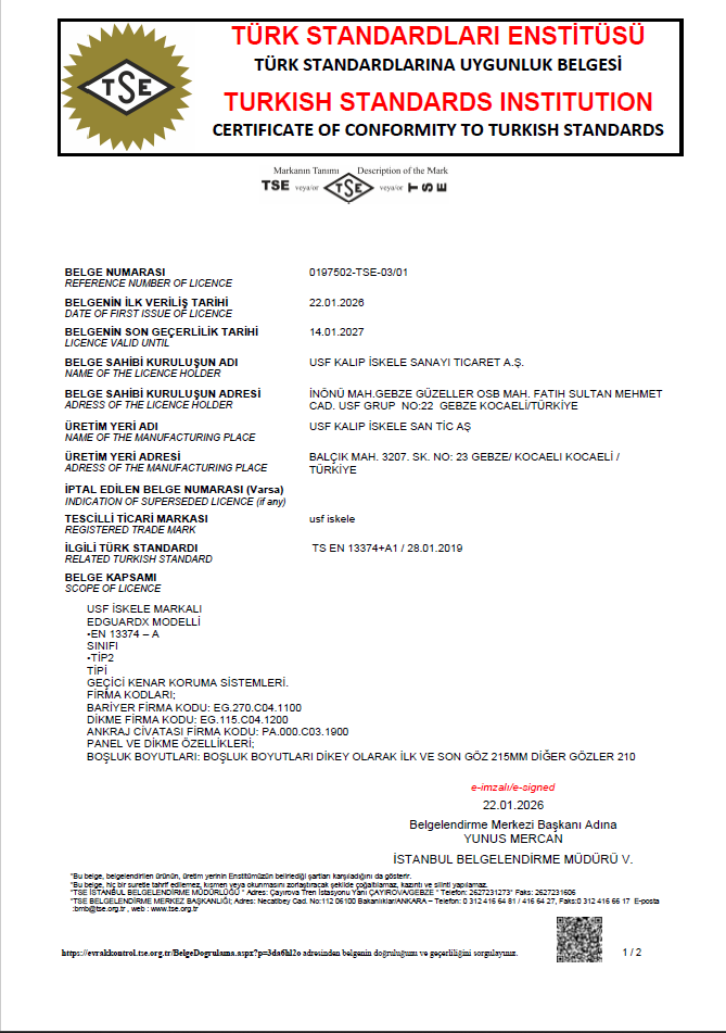 Sunulan tüm Geçici Kenar Koruma Sistemleri, USF Kalıp İskele tarafından TS EN 13374 A Sınıfı standartlarına uygun olarak üretilmiş ve belgelendirilmiştir.